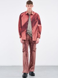 JIYONGKIM shirt in red, one-of-a-kind, signature sun faded treatment, pointed collar, mother of pearl button closure & cuffs, chest patch pocket, barrel cuffs, curved hem, boxy fit. Made in South Korea Standard Sizing 100% Cotton Model is 6’3” wearing size L. Shoulders: 20” Chest: 36” Waist: 31”