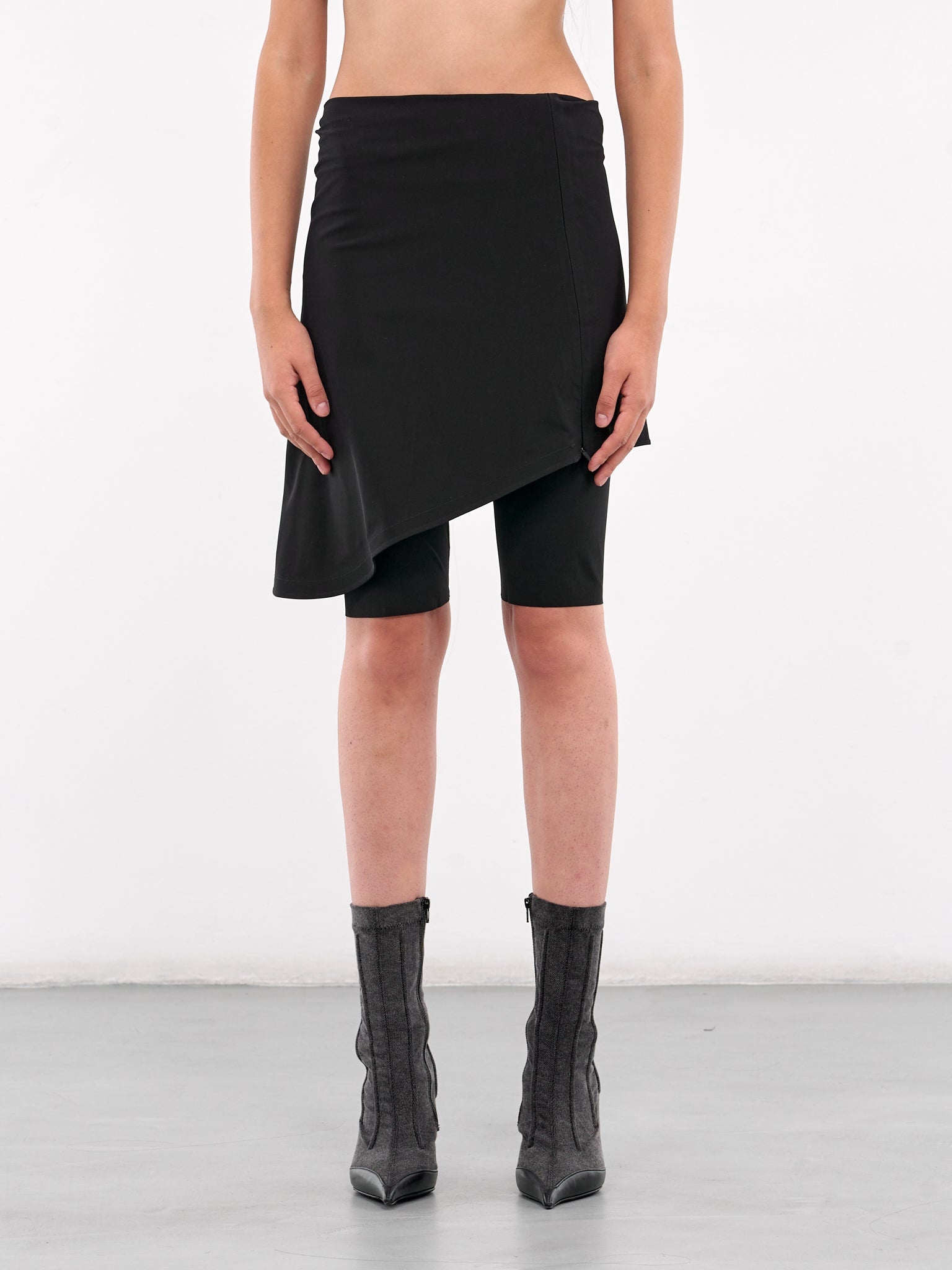 JOHANNA PARV skirt in black, paneled stretch nylon construction, high waist, asymmetric skirt overlay, above-knee length, form fit. Made in China 79% Recycled Polyamide 21% Elastane Standard Sizing Model is 5'7" wearing size S. Bust: 32.5" Waist: 24" Hips: 32"