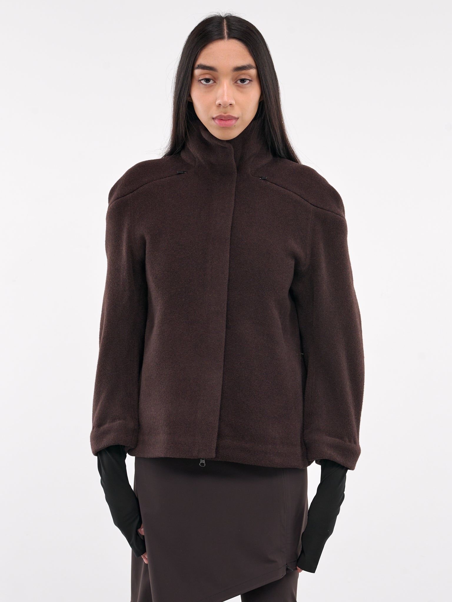 JOHANNA PARV jacket in brown, paneled wool construction, stand collar, front concealed zip placket closure, shoulder concealed zips, long sleeves, elongated cuffs & thumbholes, straight hem, relaxed fit. Made in China 100% Wool Standard Sizing Model is 5'7" wearing size S. Bust: 32.5" Waist: 24" Hips: 32"