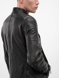 Black leather jacket with slim silhouette and rivet details. Featuring: • Slim fit • Cow leather construction • Stand collar • Concealed front placket closure • Raglan long sleeves with zip vent cuffs • Chest flap pockets and side flap pockets • Signature rivet detailing • Cinch strap at hem • Made in Japan • 100% Cow leather • Japanese sizing Model is 6'0" wearing size 3. Shoulders: 17" Chest: 30" Waist: 28"