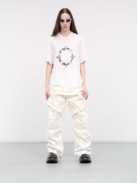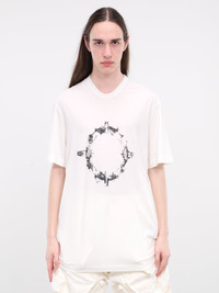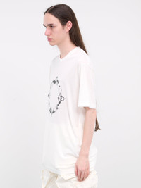 JULIUS t-shirt in white, paneled cotton-rayon construction, printed graphic, crewneck, dropped shoulders, short sleeves, straight hem, relaxed fit. Made in Japan 50% Cotton 50% Rayon Japanese Sizing Model is 5’11” wearing size 3. Shoulders: 15” Chest: 17.5” Waist: 28”