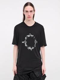 JULIUS t-shirt in black, paneled cotton-rayon construction, printed graphic, crewneck, dropped shoulders, short sleeves, straight hem, relaxed fit. Made in Japan 50% Cotton 50% Rayon Japanese Sizing Model is 5’11” wearing size 3. Shoulders: 15” Chest: 17.5” Waist: 28”