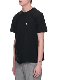 JUNTAE KIM t-shirt in black, corset design, cotton jersey, crewneck, chest pocket, logo woven label, short sleeves, waved hem, regular fit. Made in South Korea Standard Sizing 100% Cotton Model is 5'11" wearing size S. Shoulders: 18" Chest: 34" Waist: 29"