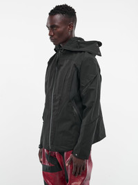 JUNTAE KIM jacket in black, windbreaker design, paneled mixed-material construction, all-over gather slashing, high neck, hood, front concealed two-way zip closure, long sleeves, button fastened cuffs, side zip pockets, curved hem, relaxed fit. Made in South Korea Fabric 1: 100% Polyester Fabric 2: 65% Polyester 35% Nylon Fabric 3: 82% Nylon 18% Spandex Standard Sizing Model is 5'11" wearing size L. Shoulders: 19" Chest: 38" Waist: 30"