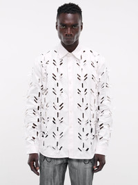 JUNTAE KIM shirt in white, cotton-poly blend, paneled construction, all-over laser slashed pattern, spread collar, front buttoned placket closure, long sleeves, barrel cuffs, shirttail hem, regular fit. Made in South Korea 59% Cotton 29% Polyester 12% Nylon Standard Sizing Model is 5'11" wearing size L. Shoulders: 19" Chest: 38" Waist: 30"