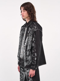 JUNTAE KIM shirt in black & white, paneled denim construction, trompe l'oeil graphic print, spread collar, front button placket closure, long sleeves, button cuffs, shirttail hem, relaxed fit. Made in South Korea 100% Cotton Standard Sizing Model is 6'0" wearing size M. Shoulders: 18" Chest: 36" Waist: 30"