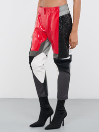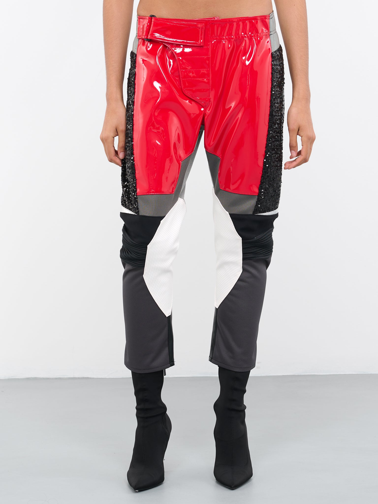 JUNYA WATANABE pants in red black, paneled biker design, sequins detailing, low-waist, asymmetric velcro closure, straight leg, cropped, regular fit. Standard Sizing Model is 5'10" wearing size S. Bust: 32" Waist: 25" Hips: 35"