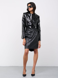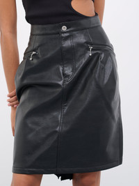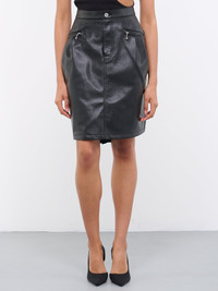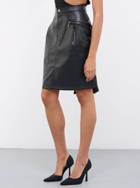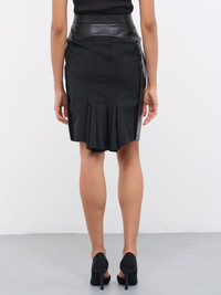 JUNYA WATANABE skirt in black, paneled design, leather construction, high-waist, button & zip-fly, side zip pockets, back contrasting pleated panel, mid-length, tailored fit. Standard Sizing 100% Cotton Model is 5'10" wearing size S. Bust: 32" Waist: 25" Hips: 35"