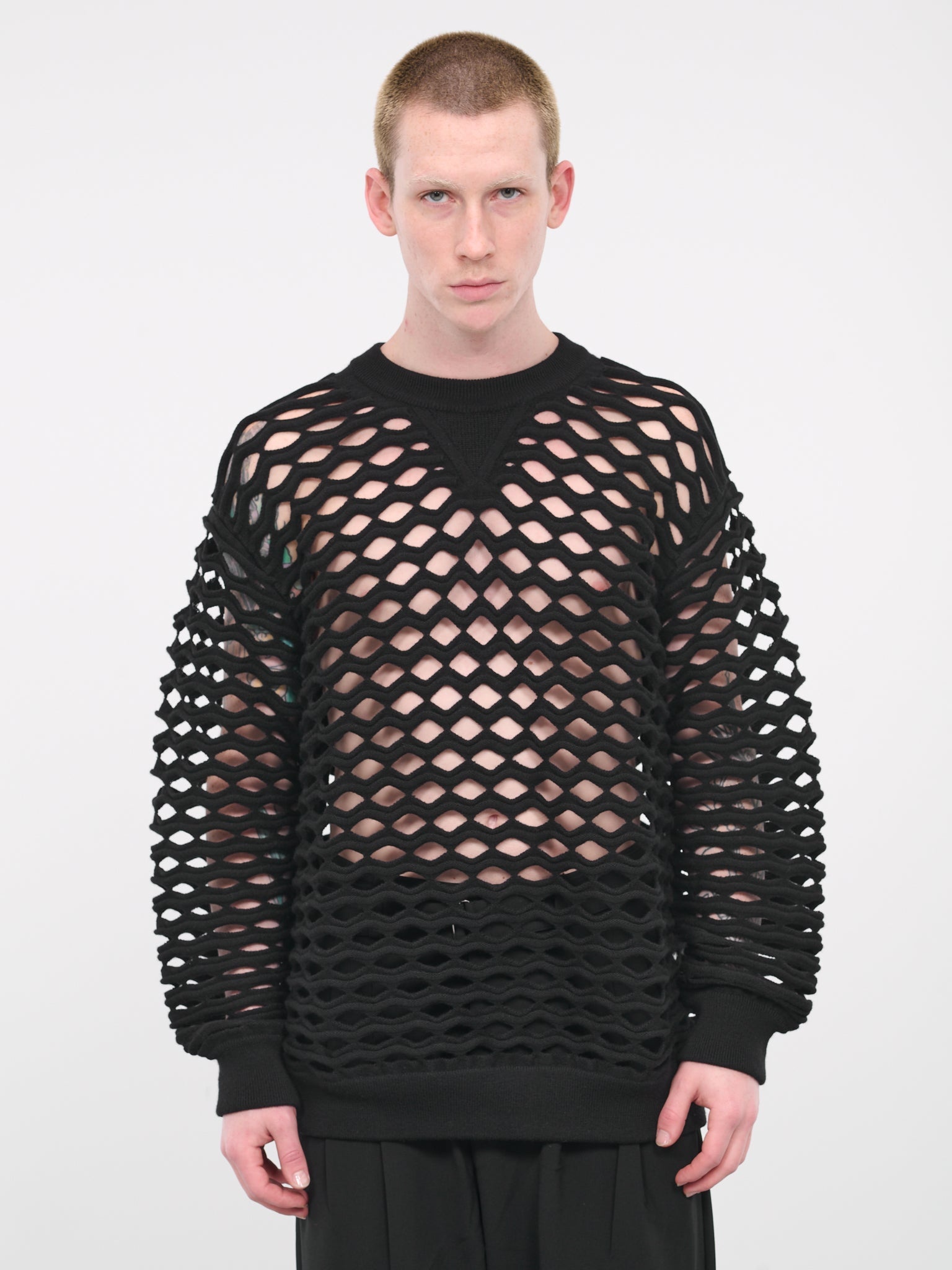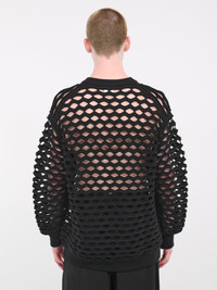 JUNYA WATANABE MAN sweatshirt in black, wool construction, diamond cut-out design, rib knit crewneck & v-stitch, dropped shoulders, rib knit elasticated cuffs & hem, full length, oversized fit. Made in Japan 100% Wool Standard Sizing Model is 6’0” wearing size M. Shoulders: 19" Chest: 38” Waist: 30”