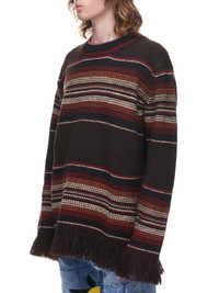 Junya Watanabe MAN sweater in brown, fringe detailing along cuffs and hemline, horizontal stripe pattern, crew neck collar, slight drop shoulder, long sleeves. Made in Japan Standard Sizing Composition: 100% Wool Model is 5'9" and is wearing size M. Shoulders: 18" Chest: 37" Waist: 29"