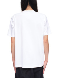 Junya Watanabe Man shirt in white, crew neck collar, short sleeves, paisley pattern throughout front panel. Made in Japan. Standard Sizing. Composition: 100% Cotton. Model is 6'2" and is wearing a size M Shoulders: 18" Chest: 36" Waist: 28"