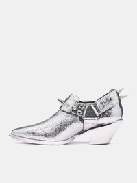 JUNYA WATANABE boots in silver, leather construction, metallic coating, crackled effect, ankle-high, low-top, slip-on style, spiked harness strap, side elastic gussets, pointed toe, Cuban heel, lined. Made in Japan 100% Leather Women's US Sizing