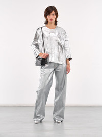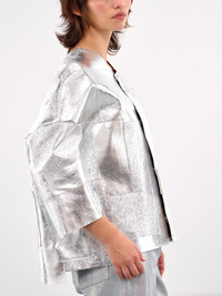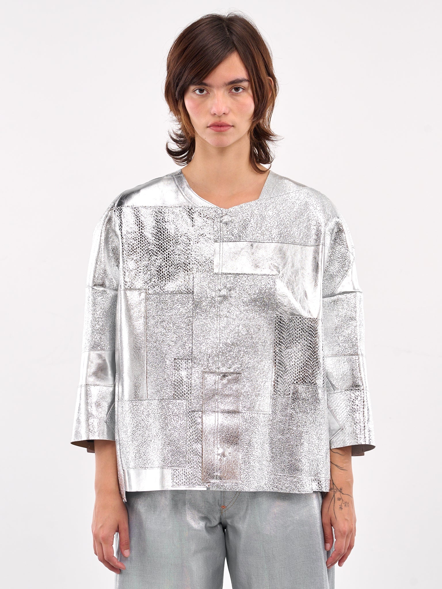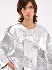 JUNYA WATANABE jacket in silver, paneled mixed-material construction, patchwork multi-texture pattern, reflective, asymmetric neck, three-quarter length sleeves, asymmetric hem, boxy fit. Standard Sizing Model is 5'7" wearing size S. Bust: 34" Waist: 26" Hips: 34"