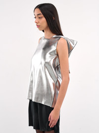 JUNYA WATANABE blouse in silver, paneled poly construction, reflective coating, round neck, sleeveless, armscyes, back shoulder structuring, back draping, straight hem, relaxed fit. Made in Japan 100% Polyester Standard Sizing Model is 5'7" wearing size S. Bust: 32.5" Waist: 24" Hips: 32"
