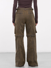 JUUN.J pants in brown, paneled denim construction, belt loops, side cinch straps, front button & concealed zip fly closure, inset pockets, back welt pockets, side cargo pockets, knee detachable paneling, cuff zip vents, Made in Korea 100% Cotton French Sizing Model is 5'6" wearing size 36. Bust: 31" Waist: 24" Hips: 34"