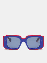 JW ANDERSON sunglasses in blue & red, acetate construction, abstract shape frames, two-tone, temple gold-tone logo, fixed nose pads, blue-tinted lenses, circle tip, case included. Made in China Acetate One Size