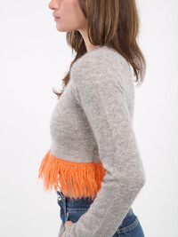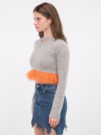 JW ANDERSON grey sweater, mid-weight, mohair-blend knit, embroidered logo, round neck, slit detail, elongated sleeves, fringe hem, ribbed trim, cropped, slim fit, true to size. Imported 52% Mohair, 35% Polyamide, 13% Merino Wool Standard Sizing Model is 5'9" wearing size S. Bust: 32" Waist: 24" Hips: 34"