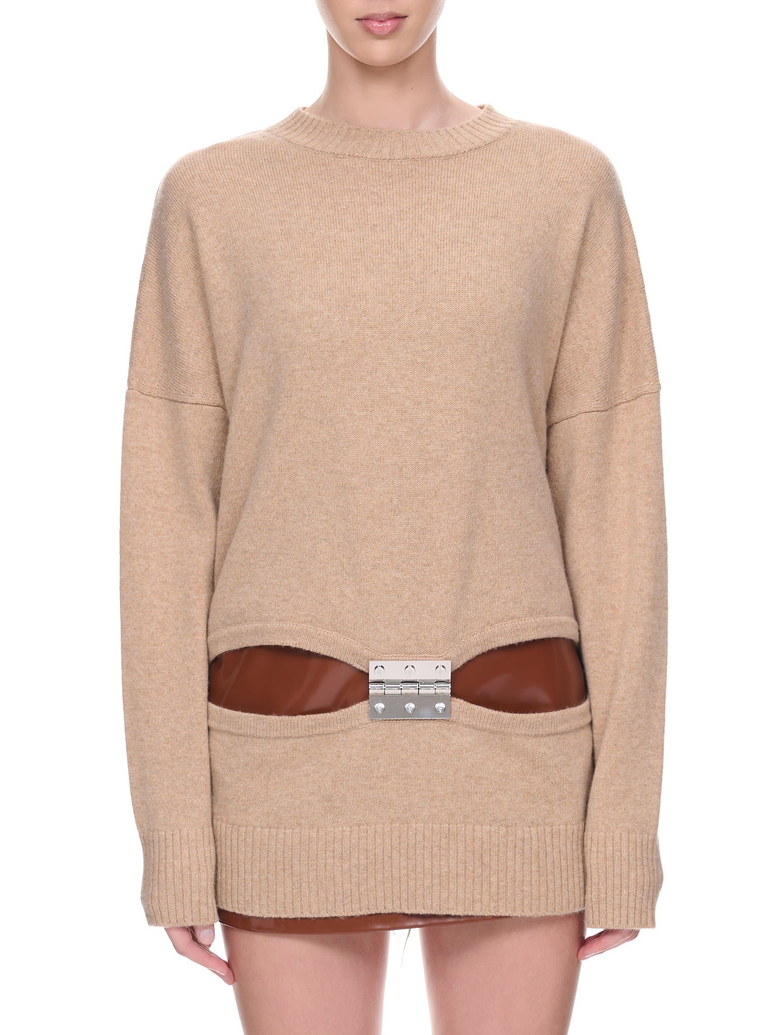JW ANDERSON sweater in beige, knit construction, slit & hinge details, drop shoulder, ribbed trims, back logo embroidery, mid-weight, oversized relaxed fit, gender-neutral. Imported Standard Sizing 35% Wool, 35% Nylon, 30% Cotton Model is 5'9.5" wearing size S. Bust: 32" Waist: 26" Hip: 35”