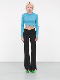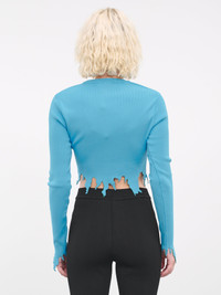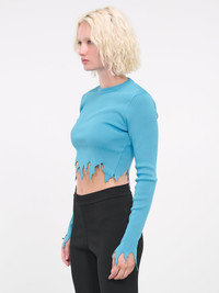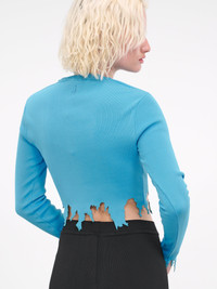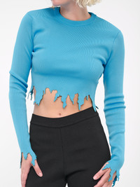 JW ANDERSON blue sweater, viscose-blend construction, ribbed knit, crewneck, back embroidered logo, laser-cut jagged hem & cuffs, elongated sleeves, cropped length, fitted. Made in Italy 65% Viscose 35% Polyamide Standard Sizing Model is 5'9" wearing size S. Bust: 32" Waist: 24" Hips: 34"