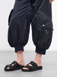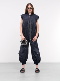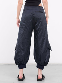 JW ANDERSON pants in navy, bomber style pants, paneled nylon construction, padded, mid-rise, belt loops, front button & concealed zip fly closure, inset pockets, back welt pocket, side oversized cargo pockets, elasticated cuffs, cropped length, balloon leg, baggy fit. Made in China 100% Polyamide UK Sizing Model is 5'10" wearing size 6. Bust: 33" Waist: 24" Hips: 35"