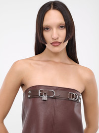 JW ANDERSON dress in brown, a-line bustier design, textured grain leather, detachable padlock strap, strapless, internal bodice, side zip closure, flared hem, unlined, mini length, regular fit, true to size. Made in Italy UK Sizing 100% Cow Leather Model is 5'8" wearing size 8. Bust: 32" Waist: 26" Hips: 34.5"