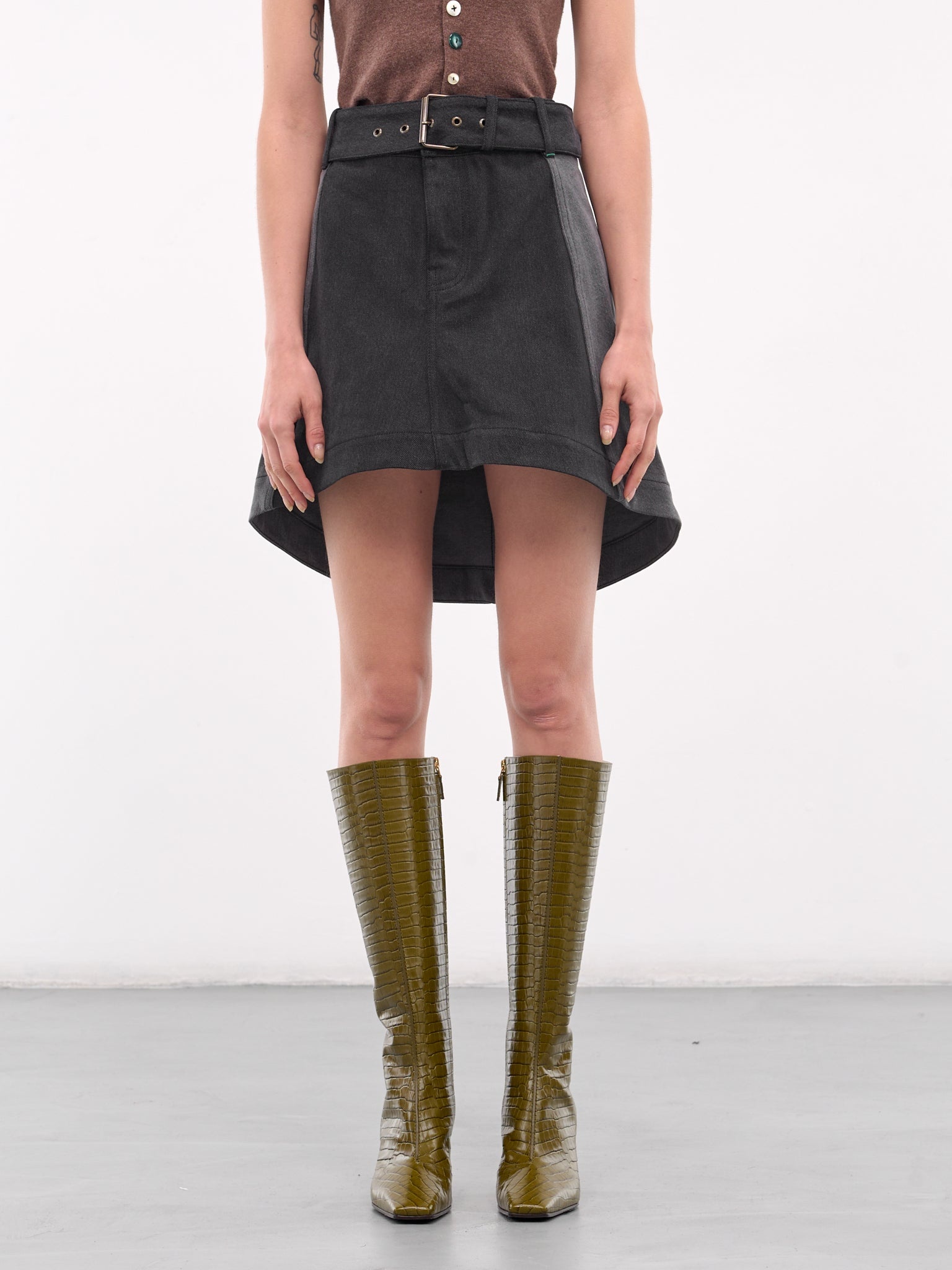 JW ANDERSON skirt in dark grey, paneled denim construction, belt loops, adjustable pin-buckle belt, back logo patch, front concealed zip fly closure, back patch pockets, curved hem, slim fit. Made in Portugal 100% Cotton UK Sizing Model is 5'9" wearing size 6. Bust: 32" Waist: 23" Hips: 34"