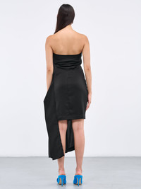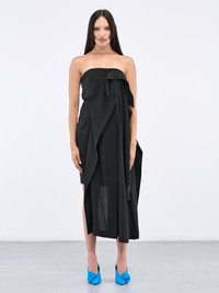 JW ANDERSON dress in black, bandeau & deconstructed trench drape design, internal bodice, lightweight, subtle shine, side zip closure, mini length, side slit, true to size. Made in Portugal UK Sizing 100% Cotton Model is 5'8" wearing size 8. Bust: 32" Waist: 26" Hips: 34.5"