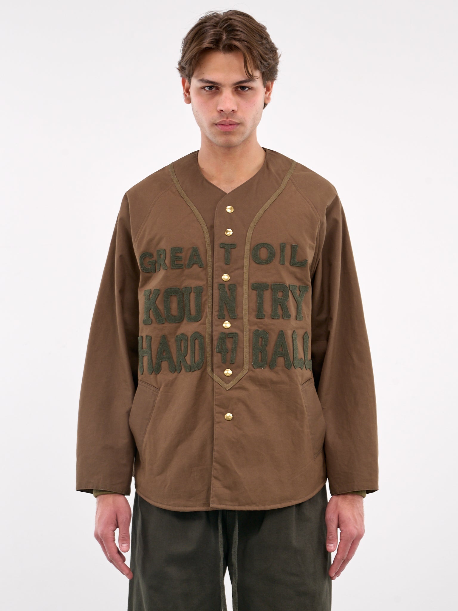 KAPITAL jacket in khaki, paneled cotton construction, padded, graphic felt embroidery, rounded neck, front button placket closure, raglan long sleeves, side welt pockets, curved hem, lined, relaxed fit. Made in Japan Outer: 100% Cotton Filling: 100% Polyester Inner: 100% Polyester Japanese Sizing Model is 6'2" wearing size 3. Shoulders: 19" Chest: 38" Waist: 31"
