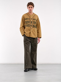 KAPITAL jacket in beige, paneled cotton construction, padded, graphic felt embroidery, rounded neck, front button placket closure, raglan long sleeves, side welt pockets, curved hem, lined, relaxed fit. Made in Japan Outer: 100% Cotton Filling: 100% Polyester Inner: 100% Polyester Japanese Sizing Model is 6'2" wearing size 3. Shoulders: 19" Chest: 38" Waist: 31"