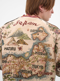 Beige souvenir jacket with a knitted construction featuring linen-esque texturing, floral jacquard pattern, and map of Japan souvenir embroidery at back. Featuring: • Relaxed fit • Souvenir jacket design • Linen-esque texturing • Floral jacquard pattern • Map of Japan souvenir embroidery at back • Ribbed stand collar and stripes • Two-way zip closure • Raglan long sleeves • Piping at sleeves • Rib-knit cuffs and hem • Stripes at hems and cuffs • Side welt pockets • Made in Japan • Outer: 38% Polyester 32% Rayon 30% Cotton | Lining: 100% Rayon | Filling: 100% Polyester | Separate Fabric: 100% Cotton | Rib Part: 100% Cotton • Japanese sizing Model is 6'1.5" wearing size 2. Shoulders: 18.5" Chest: 37" Waist: 31"