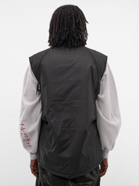 Featuring: • Relaxed fit • Padded • Synthetic leather graphic appliques at front • Stand collar • Two-way zip closure and circular zip pulls • Sleeveless and armholes • Zip vents at shoulders • Side zip pockets • Logo patch at hem • Lined • Made in Japan • Outer: 100% Nylon | Lining: 100% Polyester | Filling: 100% Polyester • Japanese sizing Model is 6’2” wearing size 3. Shoulders: 19” Chest: 38” Waist: 28”