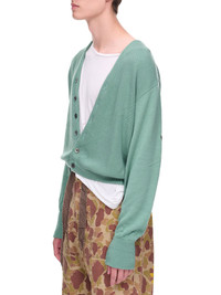 KAPITAL sweater in green, eco-knit, signature graphic at elbows, dropped shoulder, wide sleeves, collarless, mother of pearls button closure, ribbed cuffs & hem, foldable cuffs, waist length, relaxed fit. Made in Japan Japanese Sizing Composition: 90% Acrylic, 10% Wool Model is 6'3" and is wearing a size 3. Shoulders: 18.5" Chest: 35" Waist: 30"