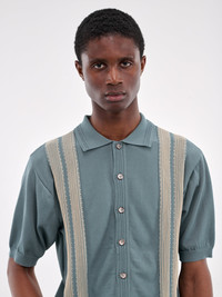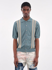 KAPITAL polo in turquoise & grey, paneled knit construction, stripe knit pattern, spread collar, front button placket closure, short sleeves, rib-knit cuffs & hem, straight hem, slim fit. Japanese Sizing Model is 6'1" wearing size 3. Shoulders: 15.5" Chest: 31" Waist: 26"