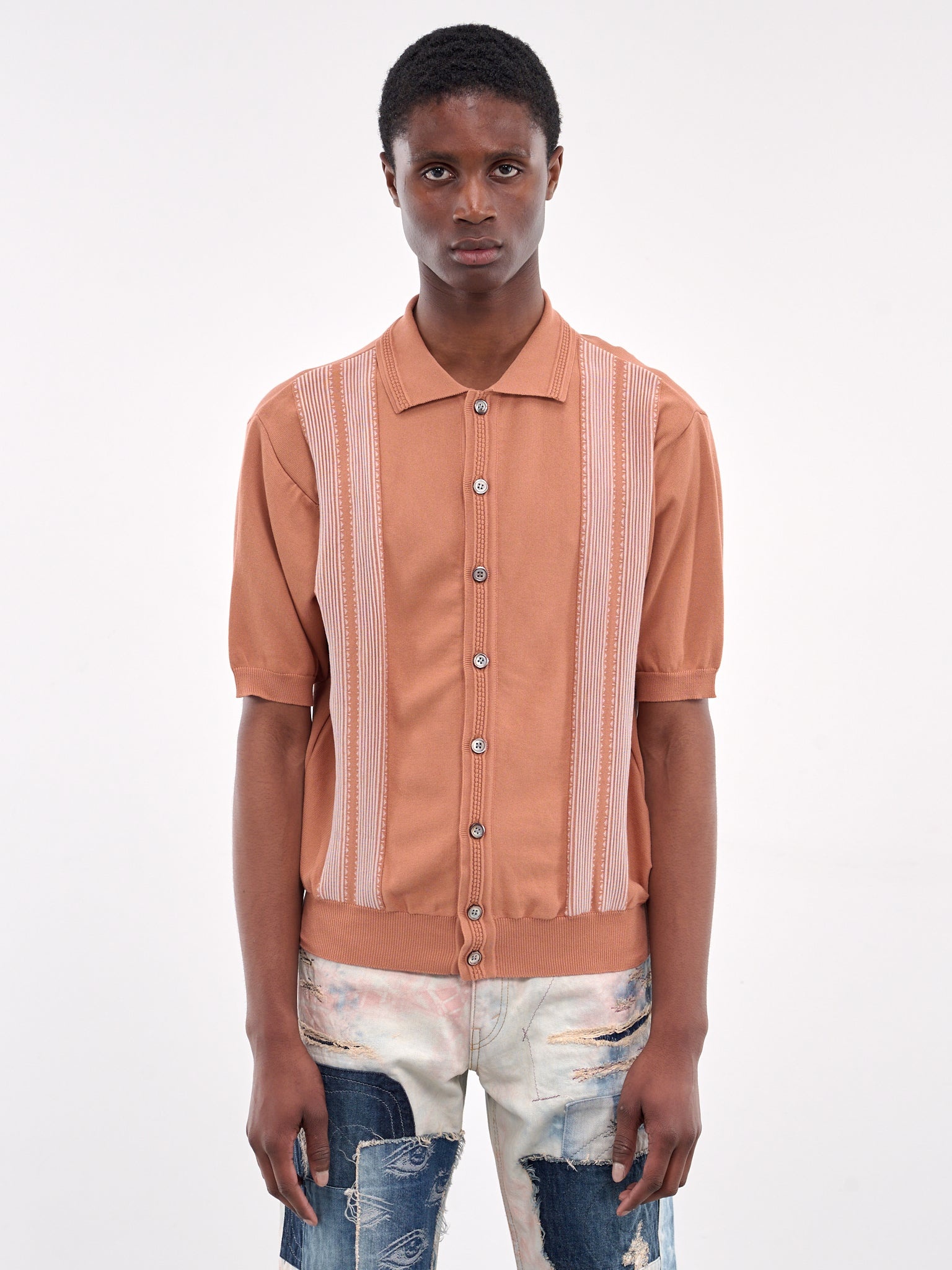 KAPITAL polo in brown & pink, paneled knit construction, stripe knit pattern, spread collar, front button placket closure, short sleeves, rib-knit cuffs & hem, straight hem, slim fit. Japanese Sizing Model is 6'1" wearing size 3. Shoulders: 15.5" Chest: 31" Waist: 26"