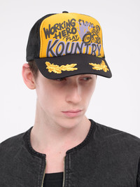 KAPITAL hat in orange & black, paneled polyester construction, branded "Kountry" graphics & text, curved brim, brim embroidery, back mesh paneling & snap strap, adjustable fit. Made in Japan 100% Polyester One Size