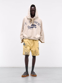 Cotton yellow shorts are constructed with a tight corduroy and printed graphics with a hand-drawn aesthetic. Cut in a wide leg with a baggy fit and finished with pleats. A creative and expressive piece that balances Kapital's timeless and artisanal aesthetic. Featuring: • Wide leg and baggy fit • Knee length • Paneled corduroy and hand-drawn graphics • Belt loops and pleating • Button fastening and zip fly closure • Four-pocket style • Comfortable lining • Made in Japan • Outer: 100% Cotton | Lining: 75% Cotton 23% Linen 2% Polyester • Japanese Sizing Model is 5'11.5" wearing size 3. Shoulders: 16" Chest: 32.5" Waist: 30"
