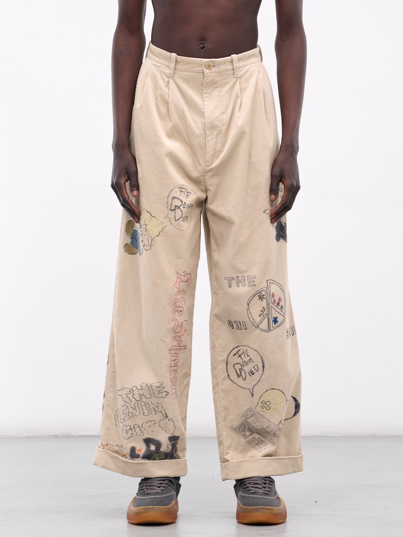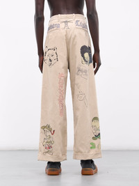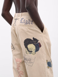 Cotton beige pants are constructed with a tight corduroy and printed graphics with a hand-drawn aesthetic. Cut in a wide leg with a baggy fit and finished with pleats and turned-up cuffs. A creative and expressive piece that balances Kapital's timeless and artisanal aesthetic. Featuring: • Wide leg and baggy fit • Paneled corduroy and hand-drawn graphics • Belt loops and pleating • Button fastening and zip fly closure • Four-pocket style and turned-up cuffs • Comfortable lining • Made in Japan • Outer: 100% Cotton | Lining: 75% Cotton 23% Linen 2% Polyester • Japanese Sizing Model is 5'11.5" wearing size 3. Shoulders: 16" Chest: 32.5" Waist: 30"