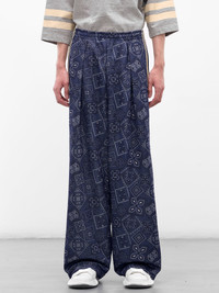 These oversized tracksuit trousers are crafted from navy blue poly jersey. Embellished with a bandana print and side striped detailing. Kapital's whimsical take on Americana is embodied in this piece. Featuring: • Oversized fit and wide leg • All-over bandana print • Elasticized waistband • Front pleating and side logo patch • Side striped embroidery • Side zip pockets • Made in Japan • 100% Polyester • Japanese sizing Model is 6'0" wearing size 3. Shoulders: 17" Chest: 30" Waist: 28"