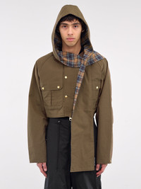 KAPITAL jacket in khaki, paneled cotton construction, oil coated, detachable hood, wrap-around scarf embellishment, front button placket closure, raglan long sleeves, button cuffs, front & back flap pockets, straight hem, plaid lining, cropped length, boxy fit. Made in Japan 100% Cotton Japanese Sizing Model is 6'2" wearing size 3. Shoulders: 19" Chest: 38" Waist: 30"