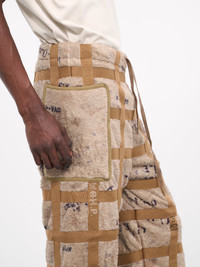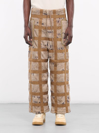 KAPITAL trousers in beige, lounge pant design, paneled fleece construction, 'prisoner' stencil print, tape grid pattern, elasticated drawstring waistband, side patch pockets, straight leg, relaxed fit. Made in Japan Outer: 100% Polyester Trim: 100% Acrylic Japanese Sizing Model is 6’2” wearing size 2. Shoulders: 19” Chest: 38” Waist: 28”