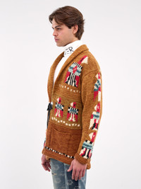 KAPITAL cardigan in brown, hand-knit, paneled wool knit construction, graphic jacquard knit pattern, shawl collar, long sleeves, front button & leather self-tie fastening, front welt pockets, straight hem, relaxed fit. Made in Japan 100% Wool Japanese Sizing Model is 6'2" wearing size 3. Shoulders: 19" Chest: 38" Waist: 31"