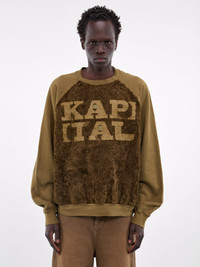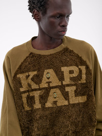 KAPITAL sweater in khaki, paneled cotton construction, graphic logo, contrast faux fur paneling, ribbed crewneck, raglan long sleeves, rib-knit cuffs & hem, straight hem, relaxed fit. Made in Japan Outer: 100% Cotton Fur: 80% Rayon 20% Cotton Japanese Sizing Model is 5'11.5" wearing size 3. Shoulders: 16" Chest: 32.5" Waist: 30"