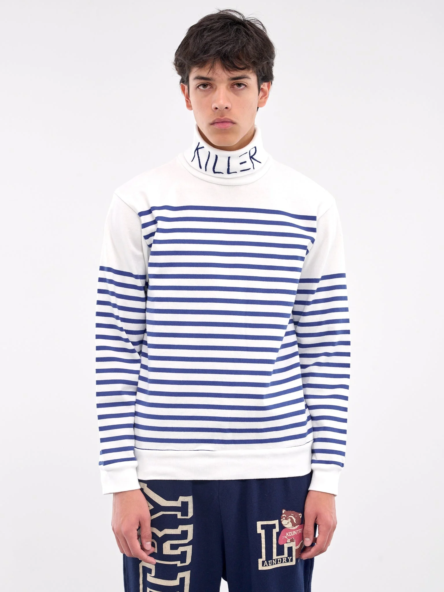 KAPITAL turtleneck in white & blue, paneled construction, stripe pattern, turtleneck, collar embroidery, long sleeves, straight hem, relaxed fit. Made in Japan Japanese Sizing Model is 6'0" wearing size 3. Shoulders: 18.5" Chest: 37" Waist: 29"