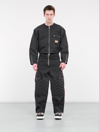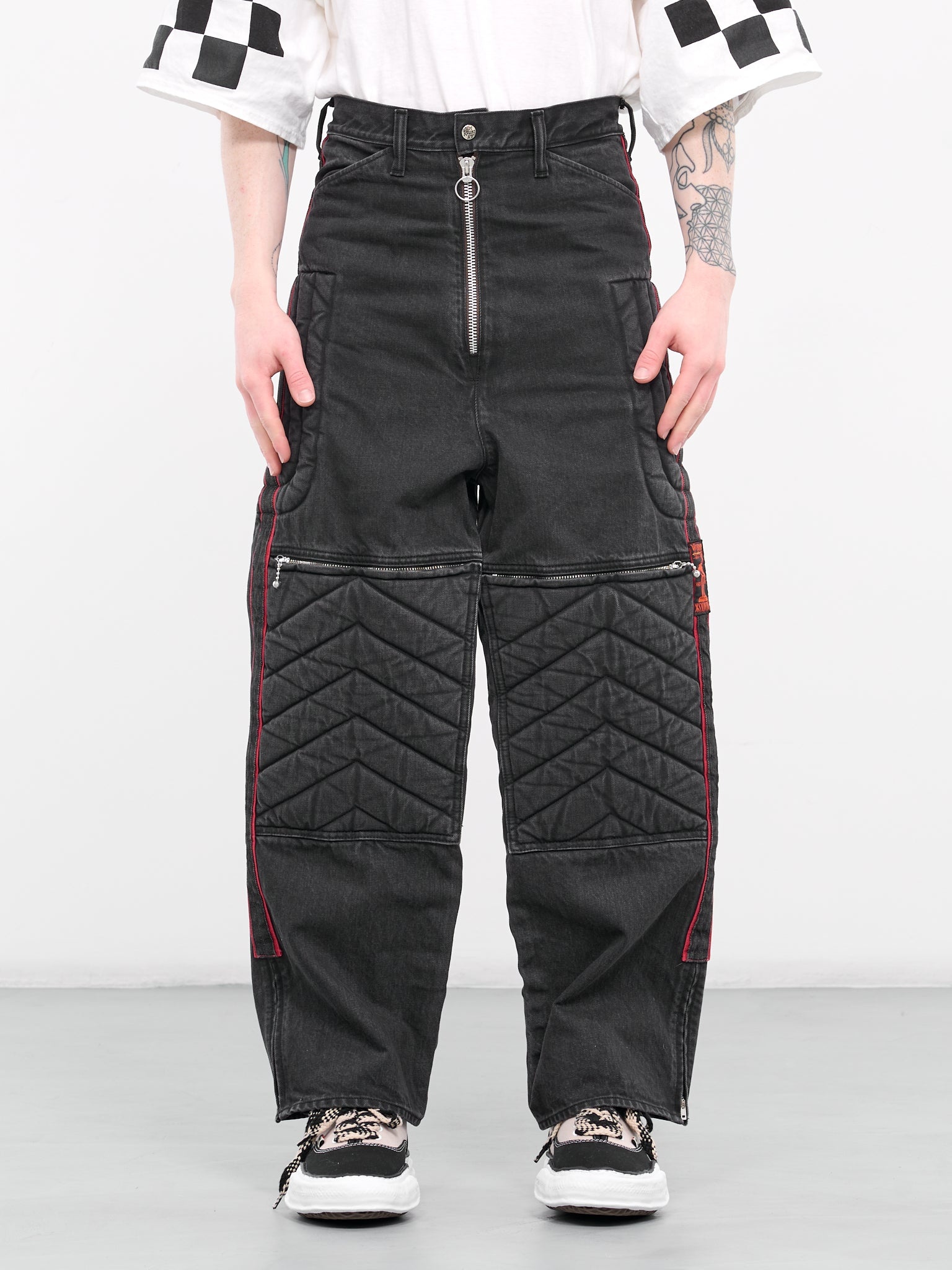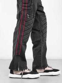 KAPITAL pants in black, motocross-style design, 14oz denim, paneled denim construction, belt loops, partially elasticated waist, back logo patch, front exposed zip closure & circular zip pull, inset pockets, back welt pocket, front & side motocross-style padding, side logo patch & tape, knee zip pockets, hem zip vents, wide leg, baggy fit. Made in Japan 100% Cotton Japanese Sizing Model is 6’0” wearing size 2. Shoulders: 19" Chest: 38” Waist: 30”