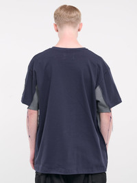 KIDILL t-shirt in grey & navy, reconstructed t-shirt design, paneled cotton construction, graphic patches, distressing & raw hems throughout, crewneck, short sleeves, straight hem, relaxed fit. Made in Japan 100% Cotton One Size Model is 6'1" wearing size OS. Shoulders: 18" Chest: 17.5" Waist: 30"