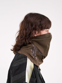 KIKO KOSTADINOV gaiter in brown, cotton-nylon blend, paneled construction, stripe pattern, contrast paneling, coated treatment, front press-stud, adjustable bungee-style drawcord, fitted. Made in Bulgaria 96% Cotton 4% Polyamide One Size