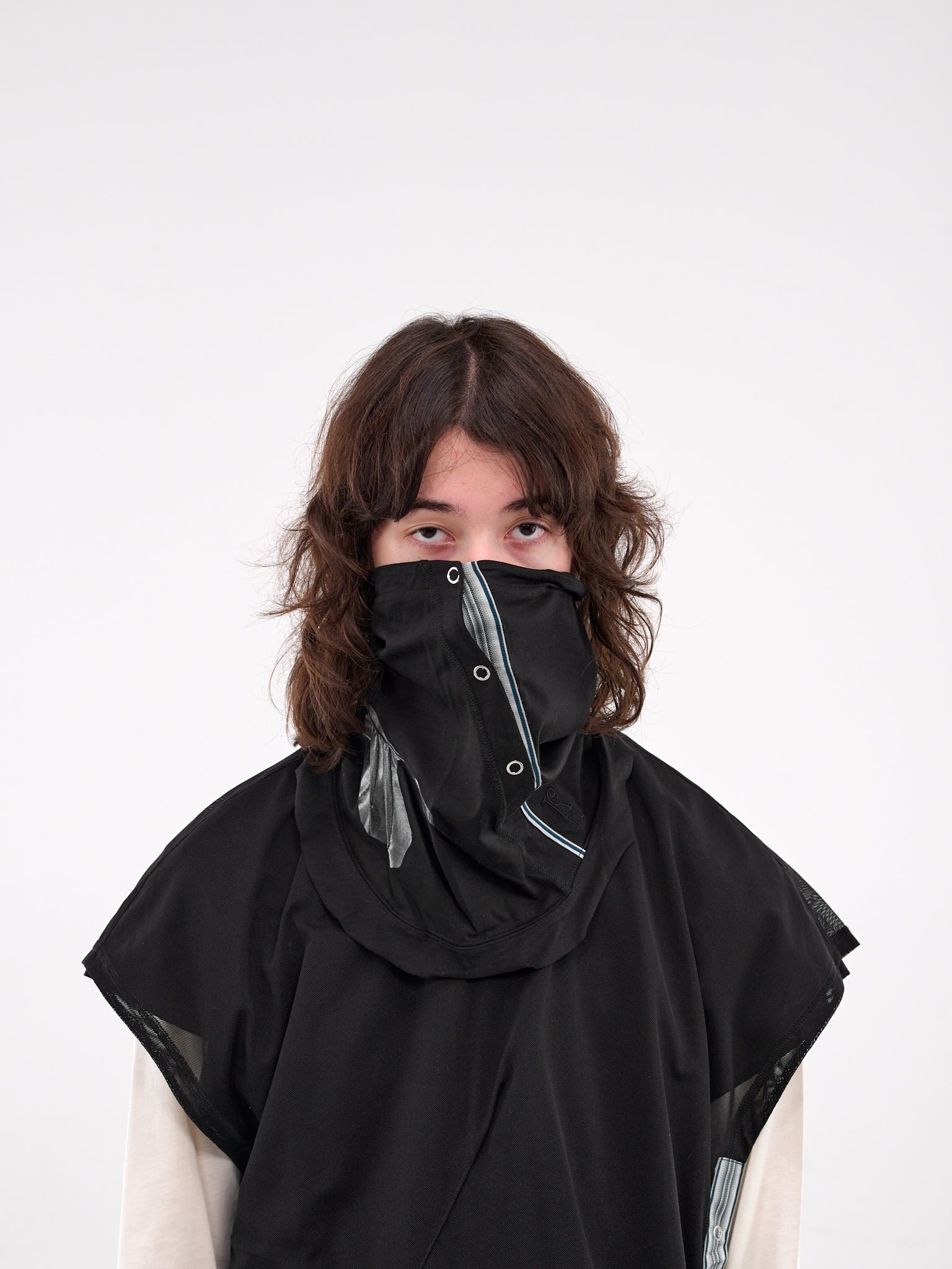 KIKO KOSTADINOV gaiter in black, cotton-nylon blend, paneled construction, stripe pattern, contrast paneling, coated treatment, front press-stud, adjustable bungee-style drawcord, fitted. Made in Bulgaria 96% Cotton 4% Polyamide One Size