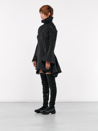 KIKO KOSTADINOV dress in black, wool-acrylic blend, paneled knit construction, turtleneck, long sleeves, fluted cuffs, hem ruffling & draping, asymmetric layered hem, mini-length, fitted. Made in Bulgaria 30% Acrylic 26% Merino Wool 26% Polyester 18% Virgin Wool French Sizing