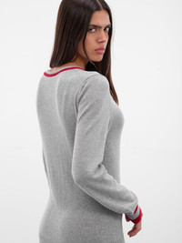 Gray paneled knit dress in cotton with striped rib-knit hems and loose ruffling for soft volume at the mini length. Featuring: • Slim fit • Paneled knit construction • V-neckline • Chest embroidery • Long sleeves • Rib-knit cuffs and waist • Loose ruffling • Mini-length • Made in Italy • Main: 100% Cotton | Secondary: 100% Polyamide • French sizing Model is 5'8" wearing size 36. Bust: 32.5" Waist: 24" Hips: 34"