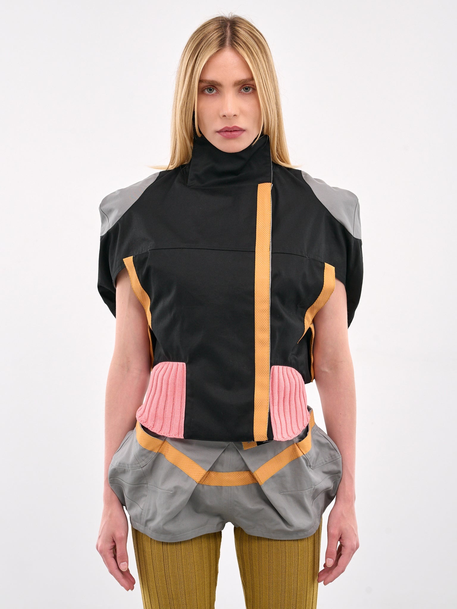 KIKO KOSTADINOV jacket in black & pink, paneled mixed-material construction, stand collar, front concealed placket closure, structured shoulders, contrast patch, sleeveless, armscyes, contrast mesh webbing, darted draping, contrast rib-knit hem, relaxed fit. French Sizing Model is 5'8" wearing size 36. Bust: 32" Waist: 24" Hips: 35"